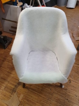 Im nächsten Schritt wird der Sessel wieder aufgebaut. Bei diesem Beispielsessel ist eine Jute an die Seiten und Rückwand zur Verstärkung angebracht worden. Dies hat den Zweck das der Schaumstoff (kommt im nächsten Schritt) besser modelliert werden kann.
